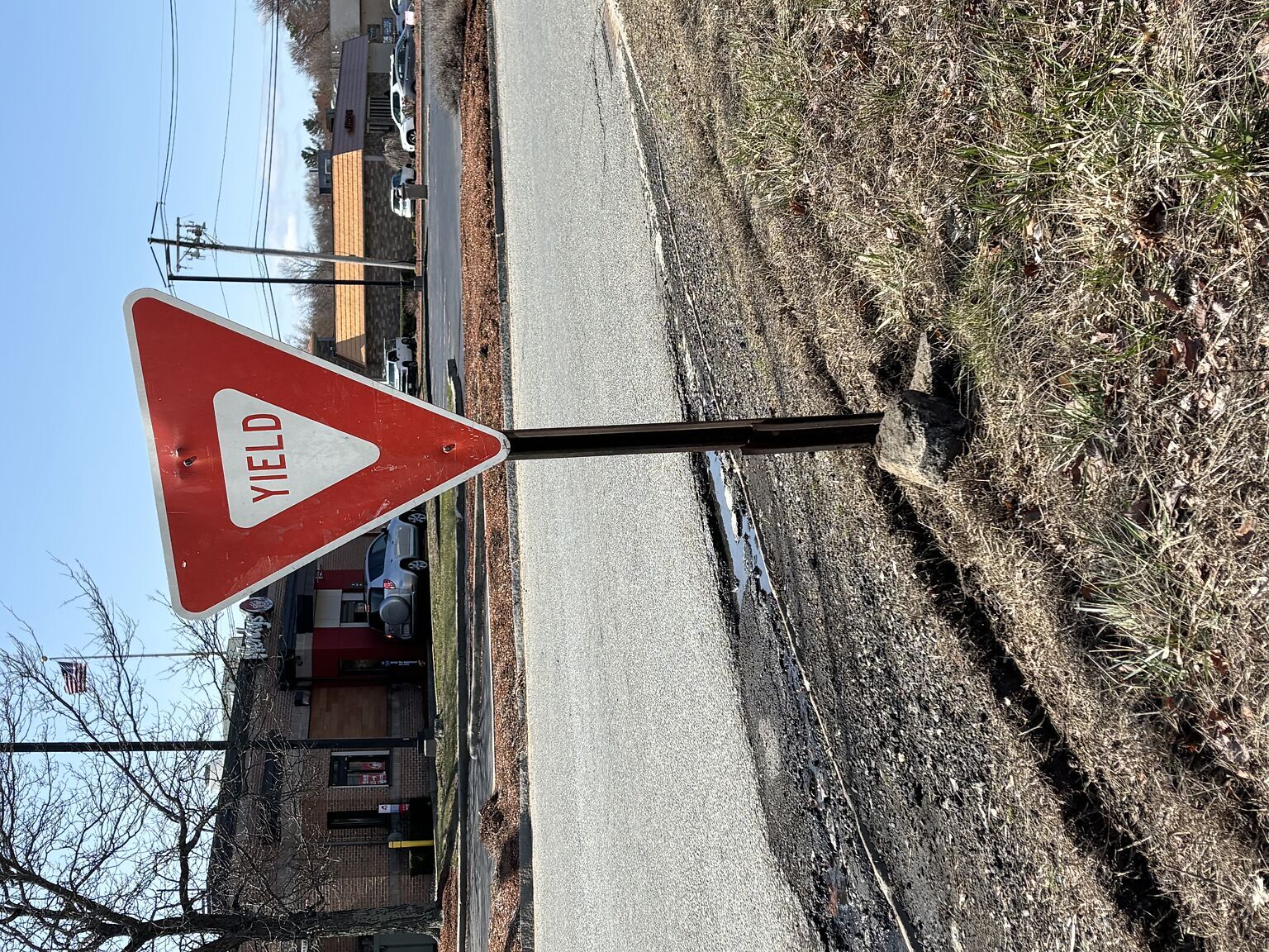 The yield sign in front of Carquest auto parts got knocked over. I put it back up and put some loose chunks of pavement at the base of the pole, but it might fall over. Could someone please check it?