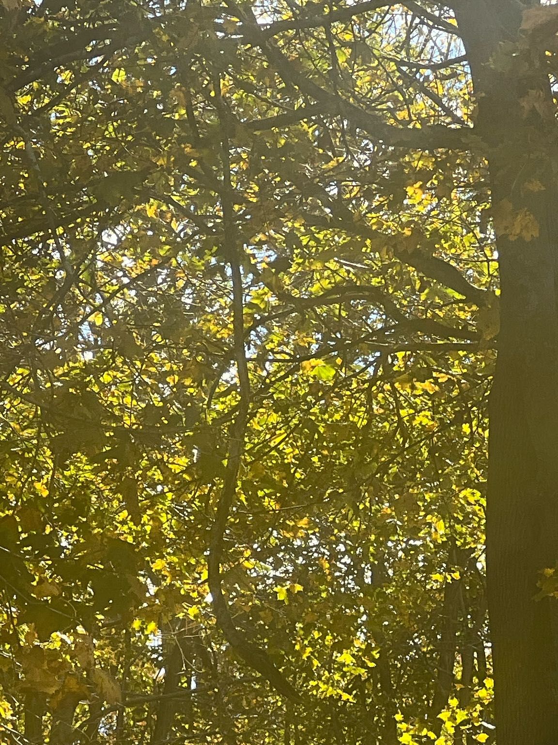 Broken tree branch dangling at park entrance. Needs trimming and leave clean up
