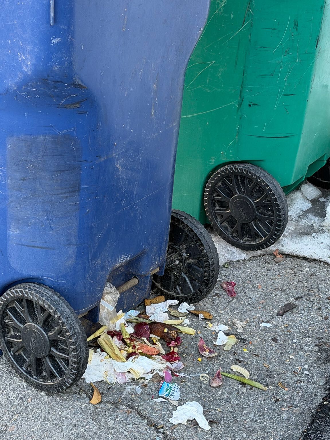 Both carts were left outside yesterday as instructed and have not been replaced. the trash is being pulled out by animals from the bottom and top. We need better barrels animal can't chew into